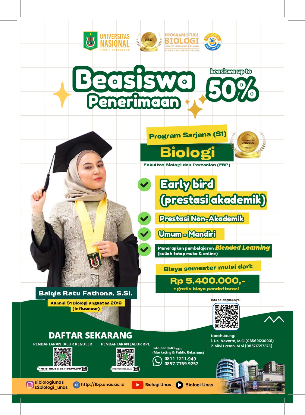 Program Studi Sarjana Biologi di Universitas Nasional menawarkan keunggulan melalui pendekatan interdisipliner dan konsentrasi studi yang dirancang untuk menjawab kebutuhan kontemporer dan masa depan dalam jurusan biologi dan pelestarian lingkungan. Dengan dua konsentrasi studi, yaitu Biologi Konservasi dan Lingkungan, dan Biomedik, program ini mempersiapkan lulusan yang tidak hanya mendalam dalam biologi dasar tetapi juga mahir dalam aplikasi praktis di sektor-sektor kritis seperti konservasi, dan kesehatan. Jurusan biologi adalah ilmu yang mempelajari tentang kehidupan, mulai dari konsep biologi umum hingga pengembangan di bidang biologi murni, menjadikannya pilihan ideal bagi mereka yang ingin kuliah jurusan biologi yang relevan dan adaptif terhadap tantangan global. Sebagai prodi biologi tertua di Jakarta, Prodi Biologi Universitas Nasional telah membuktikan eksistensinya melalui inovasi berkelanjutan, menjadikannya pilihan utama bagi calon mahasiswa yang berdedikasi pada ilmu biologi dan keberlanjutan lingkungan.