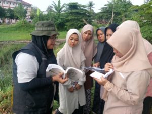 Pengasuh Pesantren Ma’had Islamy Kempek, Dr. Ny. Hj. Afwah Mumtazah, M.Pd.I antusias dengan kegiatan pengamatan satwa di lingkungan pesantren.